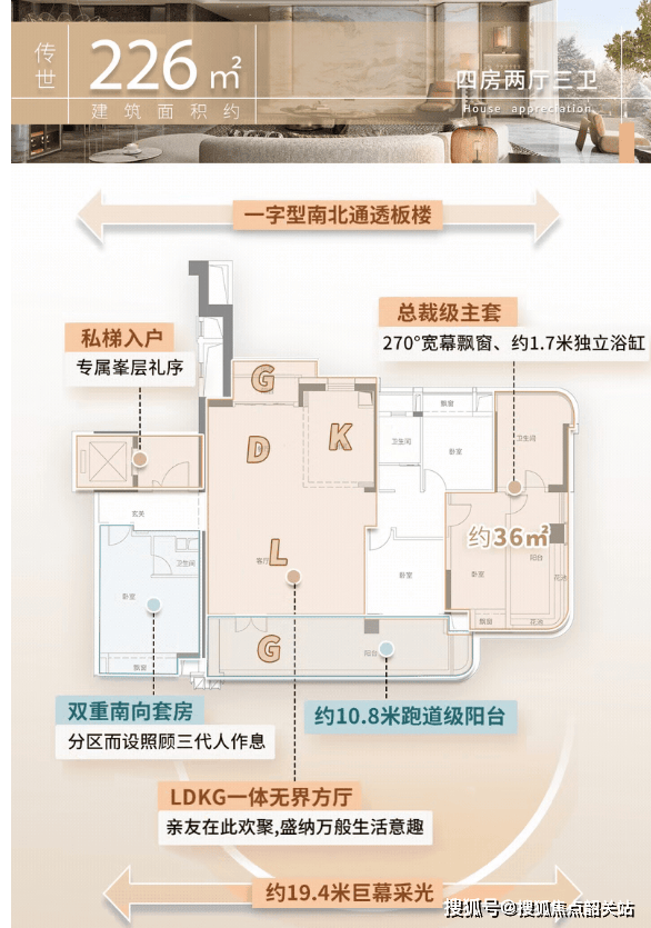 针对改善型客户,项目还提供了建筑面积约173平方米的四房双套间户型。该户型延续了LDKG+X的设计理念,并配置了中西双厨及独立中岛台,满足了家庭聚餐与社交宴请的多样化需求。双套间的设计让家庭成员之间既能保持亲密互动,又拥有独立的隐私空间。主卧面积升级至约31平方米,达到了行政套房的级别,并配备了约1.5米的独立浴缸,营造出奢华的卫浴体验。而对于追求极致居住体验的顶层客户,建筑面积约226平方米的私梯入户板式大平层则是绝佳选择。该户型采用两梯两户设计,每户独享私家电梯,尊贵感十足。LDKG+X超级聚厅包含了豪华客厅、中西双厨以及可容纳大圆桌的超大餐厅,约10.8米的跑道级阳台更是罕见。四个卧室中设置了双重南向套房,并进行了动静分区,巧妙照顾了三代人的作息习惯。主卧面积高达约36平方米,配备了约1.7米的浴缸及美妆冰箱等高端设施,全方位呵护居住者的生活品质。这些户型不仅空间利用率极高,部分产品更受益于新规红利,实现了超100%的使用率,层高也保持在3.1至3.3米之间,展现了极高的得房率与空间舒适度。