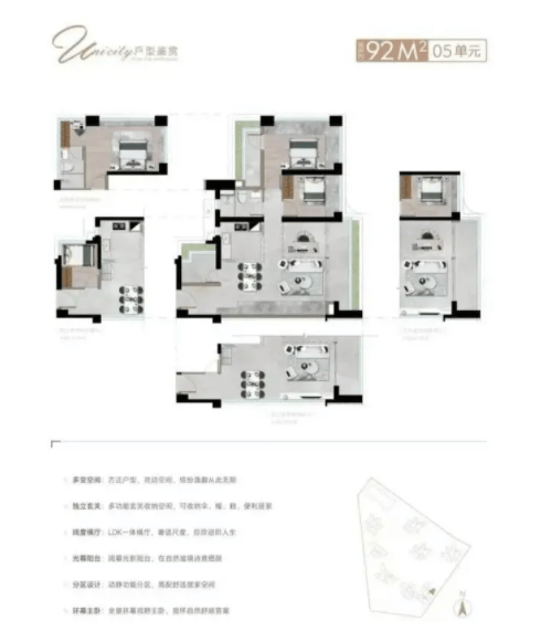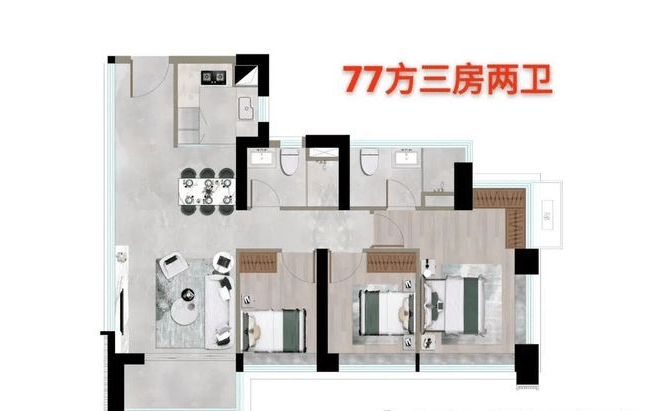 对于初次置业的年轻家庭或单身贵族而言,如何在有限的预算内获得最大的居住空间,是首要考虑的问题。力诚榕诚湾推出的建面约77㎡三房两厅一卫户型,正是为这一群体量身定制的高性价比之作。该户型布局紧凑实用,通过科学的空间规划,实现了小面积大功能的奇迹。三个卧室的设计,既能满足夫妻二人的居住需求,又能预留出儿童房或书房,适应家庭结构的变化,具有极强的成长性。在空间利用上,77㎡户型展现了极高的使用率设计。入户玄关巧妙设置,既增加了收纳空间,又起到了视线遮挡的作用,保护了室内隐私。客厅与餐厅一体化设计,视觉上扩大了空间感,让小户型也能拥有宽敞的活动区域。主卧朝南,采光通风优越,搭配全景飘窗,延伸了室内视野,提升了居住舒适度。次卧和书房虽然面积不大,但布局合理,足以满足日常使用需求。卫生间干湿分离,提高了使用效率,方便了家庭成员的日常起居。