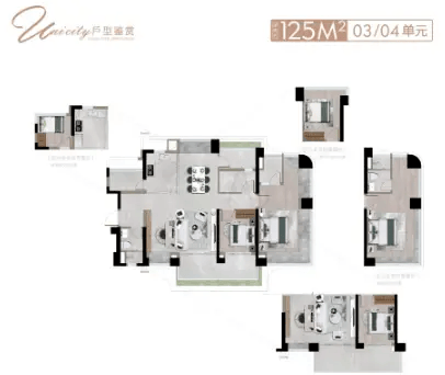 位于8栋的建面约125-140㎡四房两厅两卫户型,是专为改善型家庭打造的终极梦想居所。该户型采用了2梯4户的设计,保证了居住的私密性和便捷性。大横厅的布局,打破了传统竖厅的局限,让客厅空间更加大气磅礴,视野更加开阔。搭配南向观景阳台,可一线俯瞰花地河景,将城市的繁华与自然的静谧尽收眼底,带来无与伦比的视觉享受。这款户型在功能分区上做到了极致。独立的玄关设计,不仅增加了收纳空间,更起到了过渡和缓冲的作用,保护了室内的隐私。四个卧室的布局合理,主卧套间配备了独立卫生间和宽敞的衣帽间,满足了主人对高品质生活的追求。其他三个卧室面积充裕,可作为儿童房、老人房或客房使用,满足三代同堂或二孩家庭的居住需求。两个卫生间的配置,有效缓解了早高峰的使用压力,提升了生活的便利性。